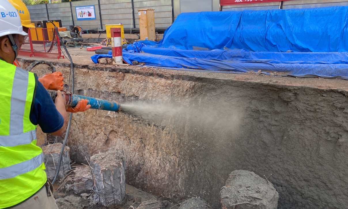 湖南長沙地鐵站項目,由中國建筑五局承建,訂購液壓濕噴機主要用于基坑支護,總施工面積100000平,為保證工期,客戶要求單日噴漿面積達到1000平方,水平輸送距離達到50米。根據(jù)客戶工程需求,產(chǎn)品經(jīng)理為客戶推薦YG-90型單噴頭液壓濕噴機,配套豫工電動16立方空氣壓縮機。液壓濕噴機采用骨料粒徑15mm的漿料,在16立方電動空壓機的完美配合下,高效噴漿,每小時噴漿量達到7m3,輸送距離輕松達到50米,完全滿足客戶施工需求。