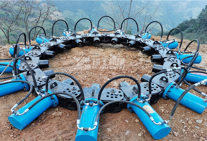 破樁機(jī)通過(guò)動(dòng)力源給截樁機(jī)多個(gè)油缸提供壓力,油缸直接驅(qū)動(dòng)釬桿,同時(shí)擠壓樁身,使樁頭截除。